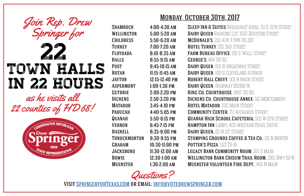 October 12, 2017 Drew Springer Rep. Springer Announces 22 Town Hall Tour in 22 Hours visiting all 22 counties of HD 68 on OCtober 30th! October 12, 2017 Drew Springer Drew Springer